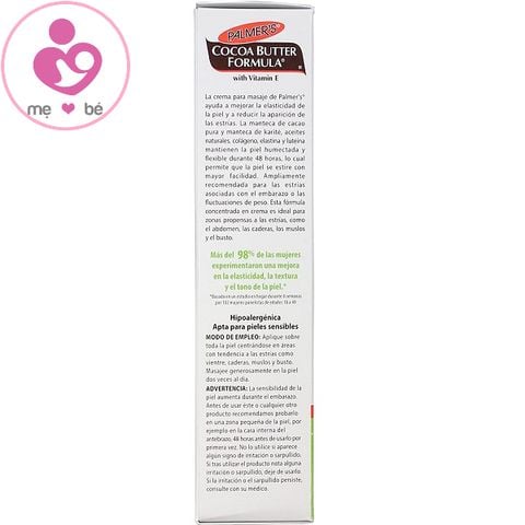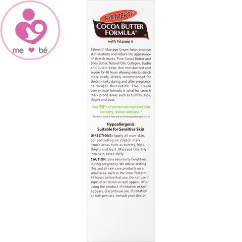 - Kem bôi chống rạn da Palmer’s Cocoa Butter Formula With Vitamin E Massage Cream Stretch Marks là sản phẩm đặc trị chuyên sâu cho những vùng da bị rạn nứt cao. Hơn 98% chị em phụ nữ tin dùng và hài lòng bởi mức độ an toàn của sản phẩm.