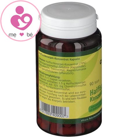- Mỗi viên nang sụn vi cá mập bổ xương khớp Allcura Haifischknorpel Konzentrat Kapseln chứa 500mg chiết xuất sụn cá mập tự nhiên, 75 mg chondroitin sulfate và 45 mg glucosamine sulphate.
