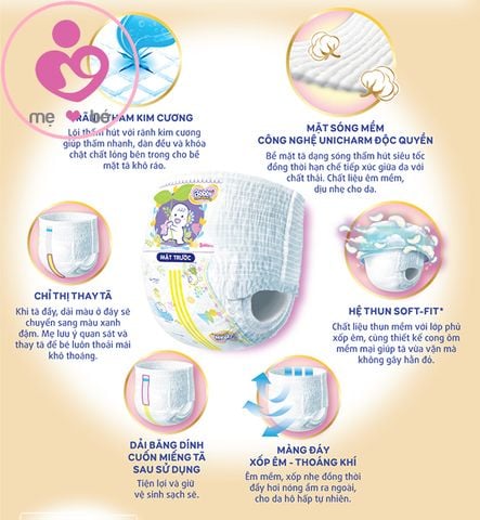 - Thun lưng co giãn Soft – Fit: Dải thun lưng được thiết kế co giãn linh hoạt vừa vặn theo từng cử động của bé giúp ngăn tràn phía lưng và mang lại cho bé cảm giác thoải mái, không bị gò bó, khó chịu khi mẹ mặc tã cho bé.