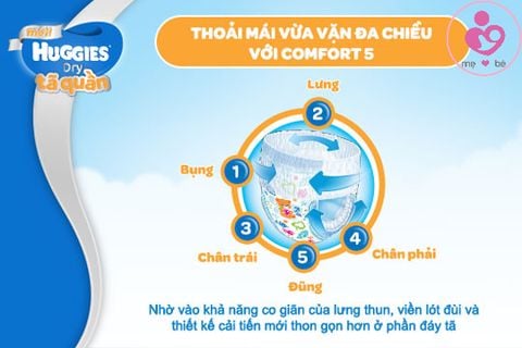 - Đai lưng co giãn mềm mại: Đai lưng co giãn mềm mại ôm vừa vặn theo những chuyển động của bé, mang lại cảm giác thoải mái. Chất liệu mềm mại toàn diện như bông diệu dàng cho da bé. Ôm vừa vặn người bé, giúp chống tràn hiệu quả. Ngoài ra, tã quần mềm mại và thoáng khí vượt trội giúp bé thoải mái và không hằn đỏ cả khi bé hoạt động nhiều.