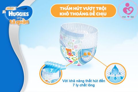 - Tã quần Huggies mới được cải tiến mỏng hơn, thấm hút hiệu quả với 7 ly chất lỏng đảm bảo không bị tràn tã, ngủ ngon sâu giấc. Ngoài ra, ưu điểm tã cho phép không khí lưu thông dễ dàng, thoát ra khỏi màng đáy nhanh gấp 10 lần. Giúp bé yêu luôn cảm thấy thoải mái, khô thoáng không quấy khóc vì khó chịu do ướt tã.