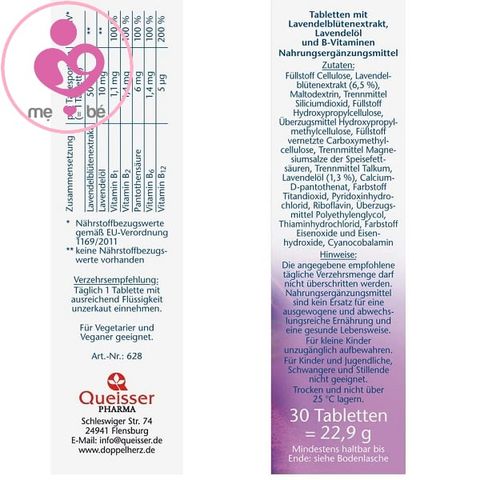 - Füllstoff Cellulose, Lavendelblütenextrakt, Maltodextrin, Trennmittel Siliciumdioxid, Füllstoff Hydroxypropylcellulose, Überzugsmittel Hydroxypropylmethylcellulose, Füllstoff vernetzte Carboxymethylcellulose, Trennmittel Magnesiumsalze der Speisefettsäuren, Trennmittel Talkum, Lavendelöl, Calcium-D-pantothenat, Farbstoff Titandioxid, Pyridoxinhydrochlorid, Riboflavin, Überzugsmittel Polyethylenglycol, Thiaminhydrochlorid, Farbstoff Eisenoxide und Eisenhydroxide, Cyanocobalamin