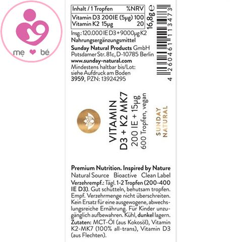 Sản phẩm Vitamin D3 + K2 MK7 (200 IE) Sunday Natural của Đức là lựa chọn hiệu quả cho trẻ từ 0 đến 4 tuổi, cung cấp vitamin D3 cùng nhiều dưỡng chất hỗ trợ tăng chiều cao và sức khỏe hệ vận động. Sản phẩm này có hai loại: